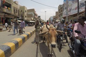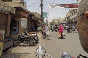 Traffic jam at railroad crossing: most impatient just lean their bikes and drag them under the barrier.